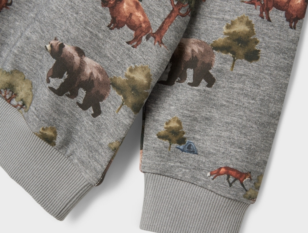 Sweatshirt i grå meleret nuance (grey melange) fra Name It MINI med print af skovdyr som bjørn, ræv og bison. En blød og varm trøje i børstet sweatkvalitet, perfekt til efterår og vinter.