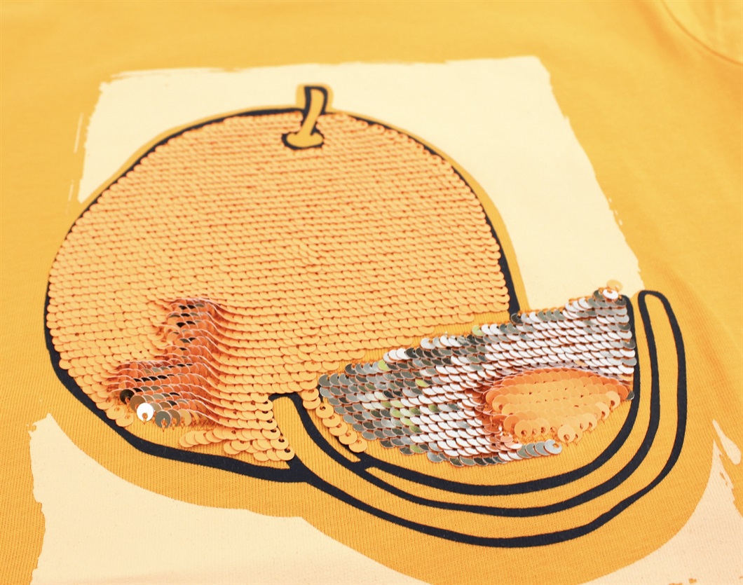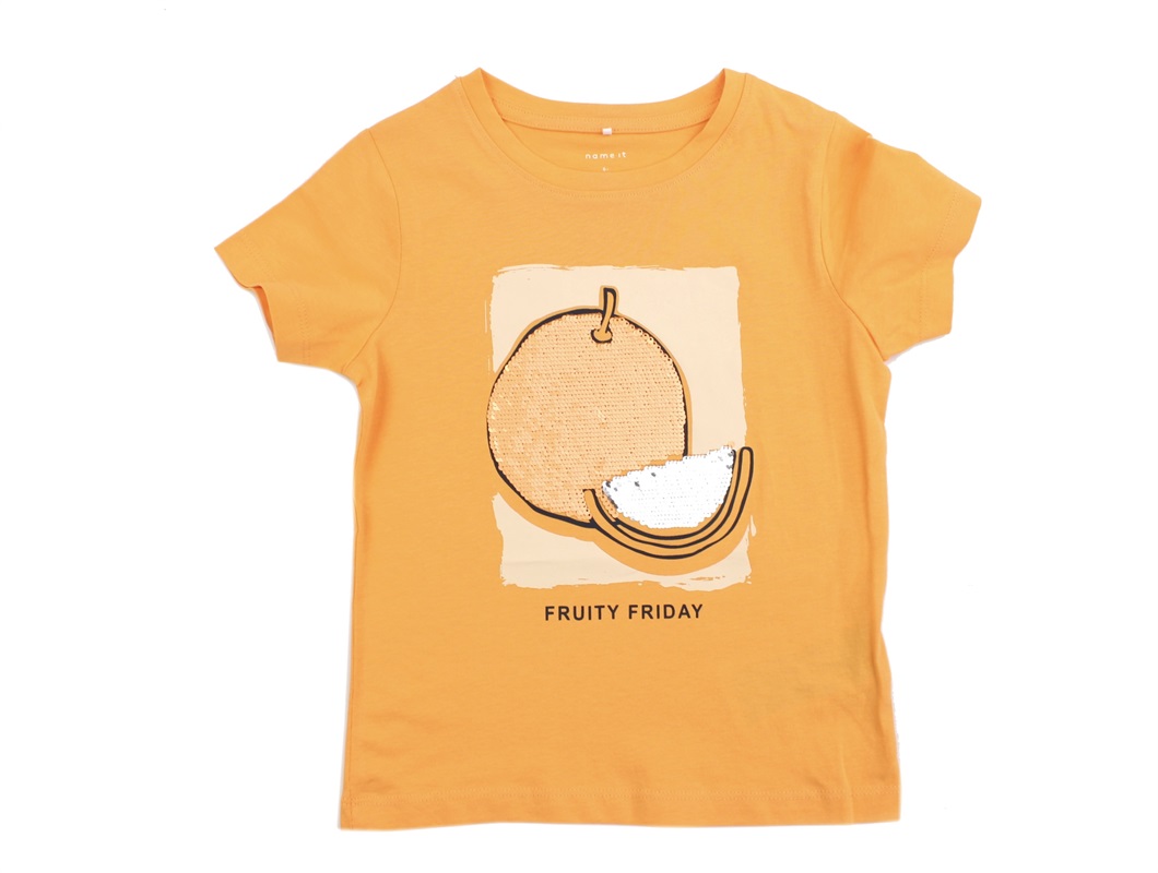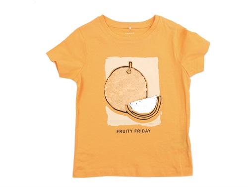 T-shirt i farven mock orange med appelsinprint og tofarvede palietter fra Name It.
