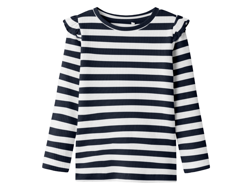 Langærmet stribet top i farverne navy blazer/cloud dancer med flæser på skulder fra Name It.