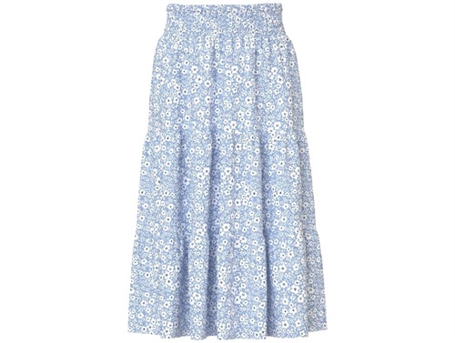 Lang blomsternederdel fra Name It i lyseblå vævet kvalitet med hvidt blomsterprint og elastisk talje.