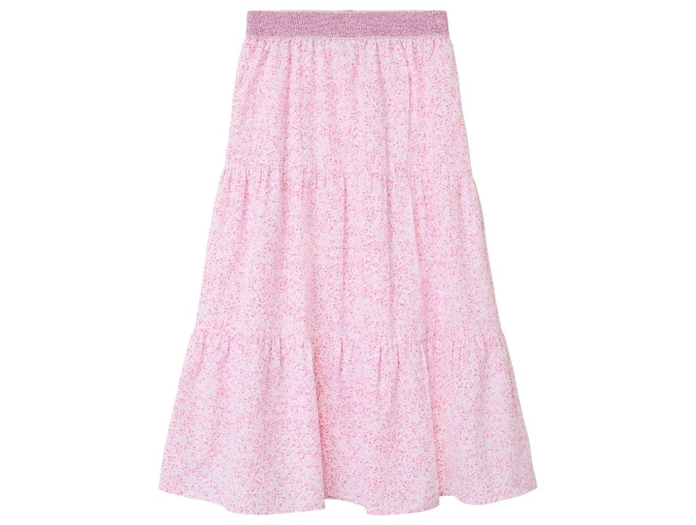 Lyserød nederdel med blomsterprint og glitterelastik i taljen fra Name It.