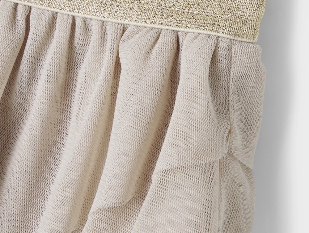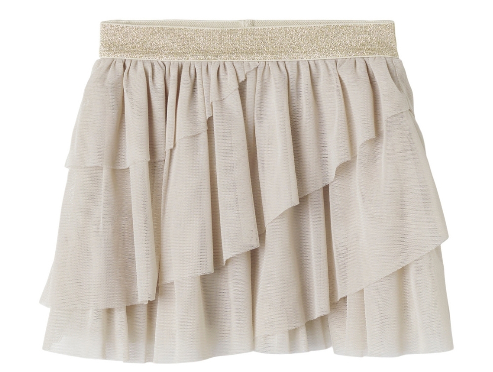 Nederdel i beige nuance fra Name It med lagdelt tyl og en glitrende elastik i taljen. Den lette og luftige kvalitet giver et fint fald og et feminint udtryk.
