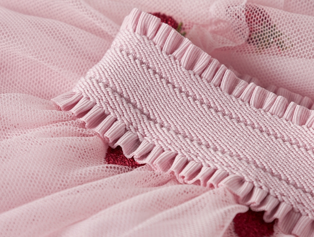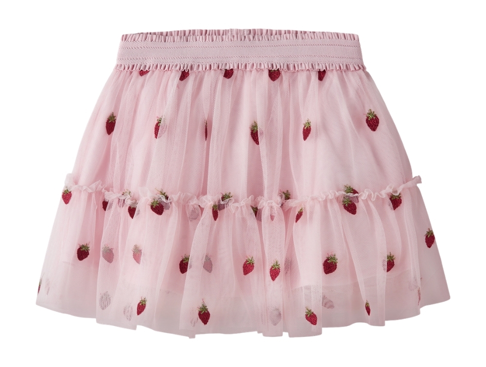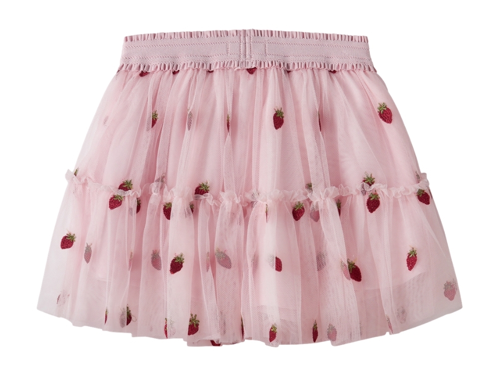 Designet har elastik i taljen, som gør den nem at tage af og på. De lagdelte tylskørter og små jordbærbroderier giver et ensartet og fint udtryk.