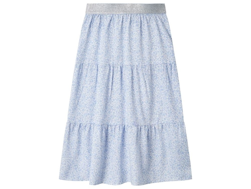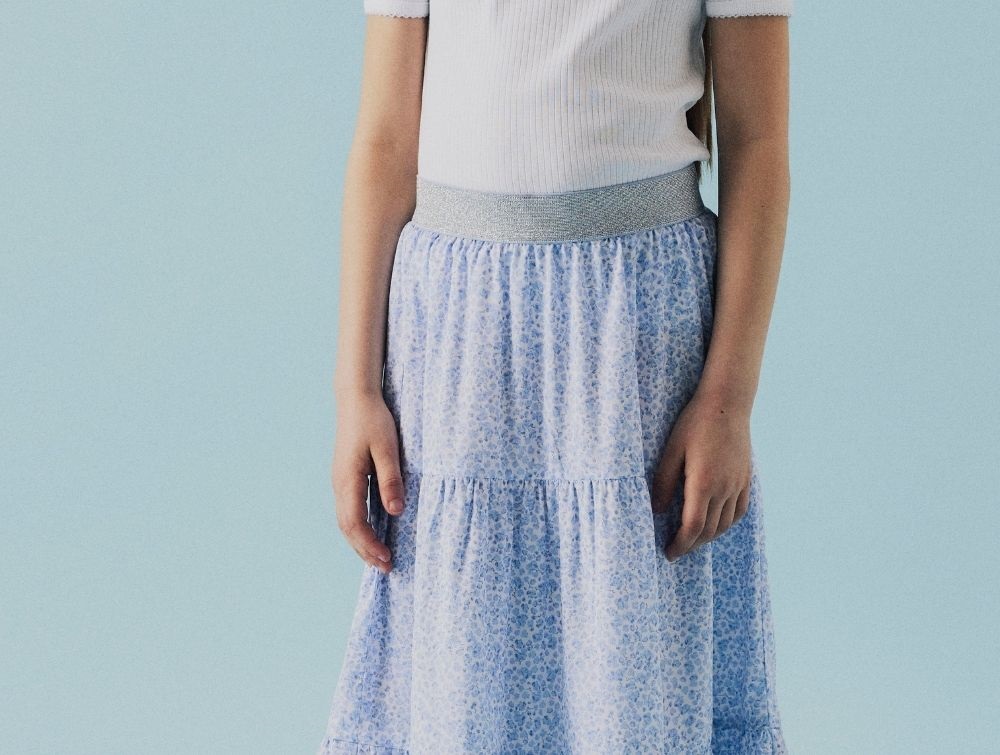 Lyseblå nederdel med blomsterprint og glitterelastik i taljen fra Name It.