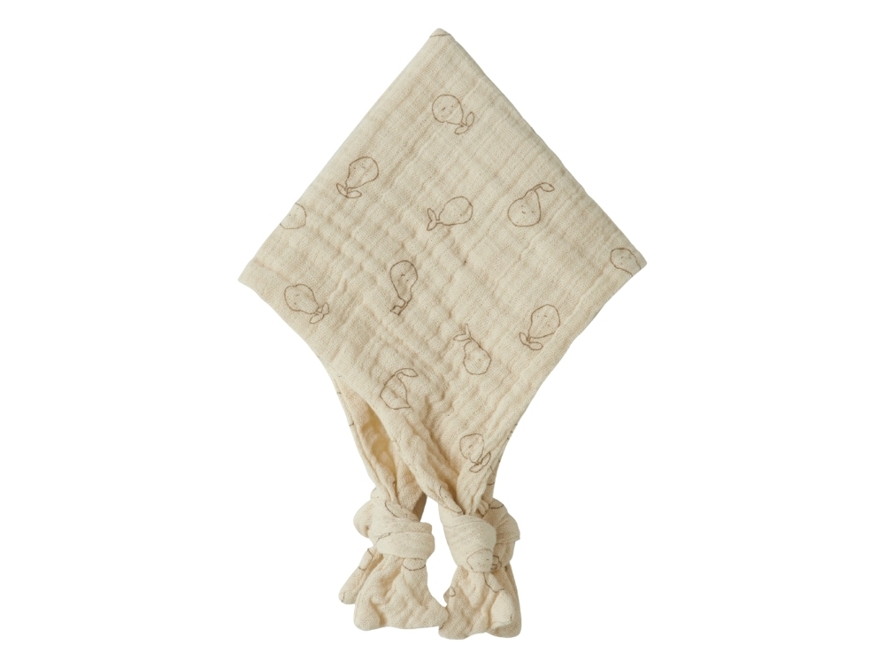 Designet er kvadratisk med knuder i hjørnerne, som gør den nem for små hænder at gribe fat i. Printet med små hvaler er jævnt fordelt over hele overfladen og giver et roligt og ensartet udtryk.