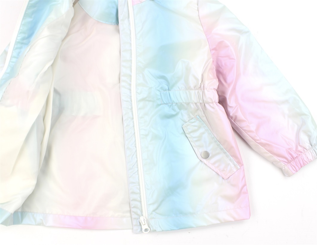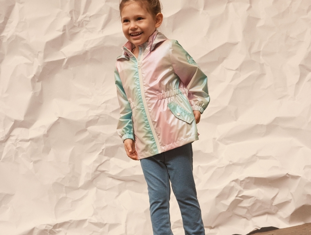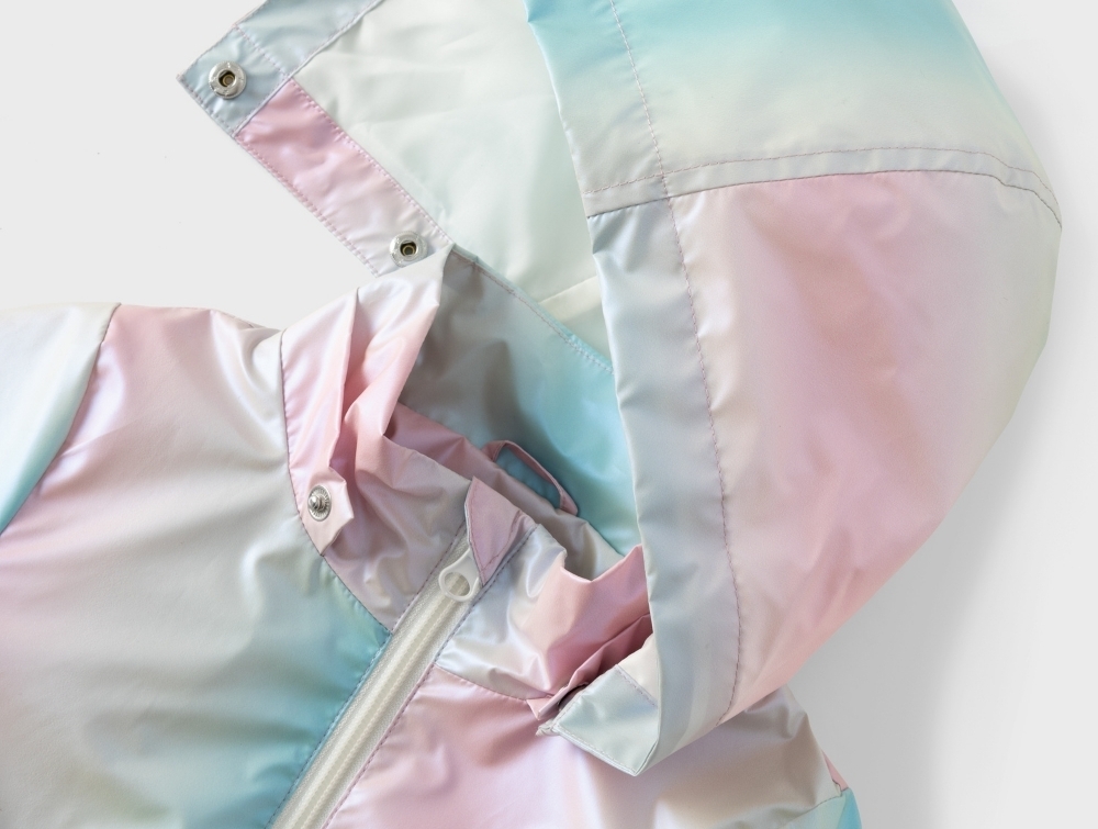 Lukkes med lynlås og har aftagelig hætte, samt elastik i taljen.