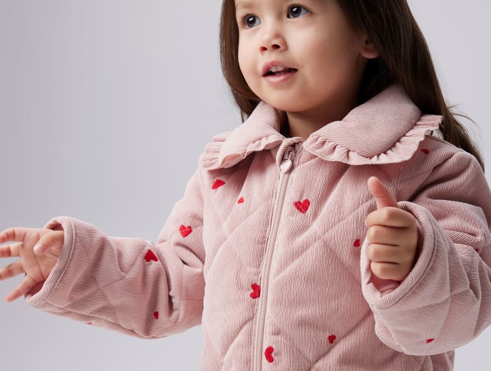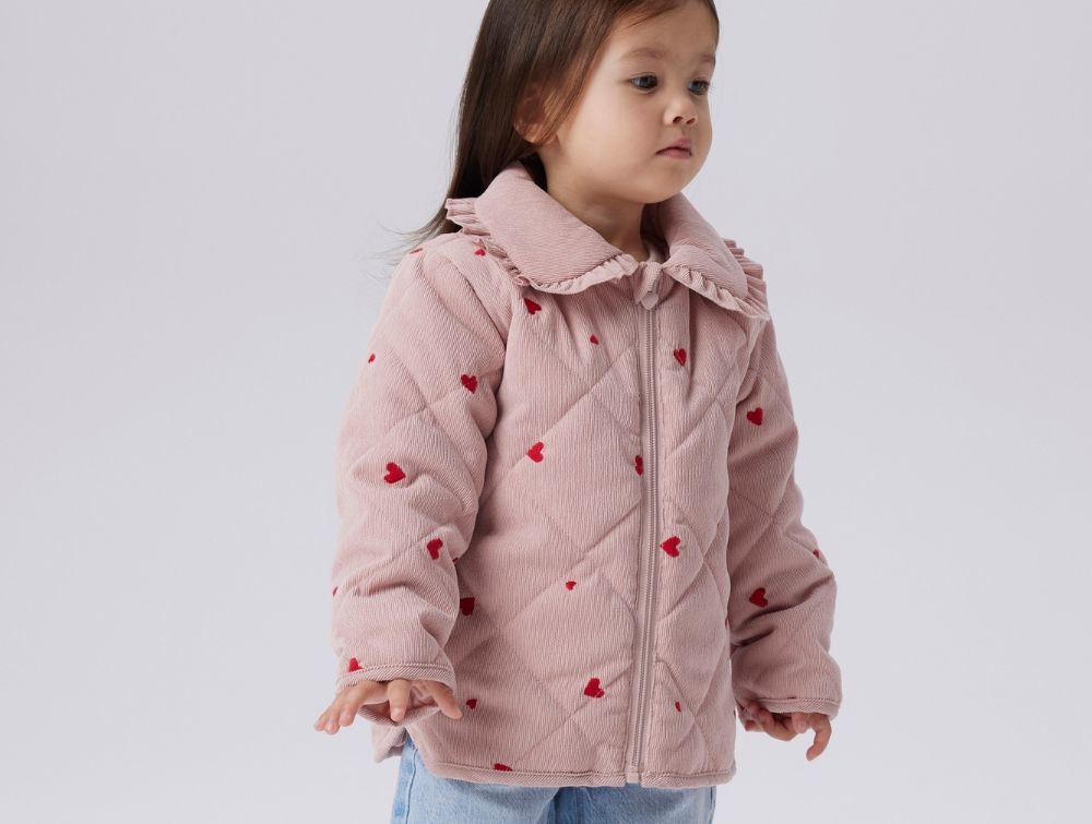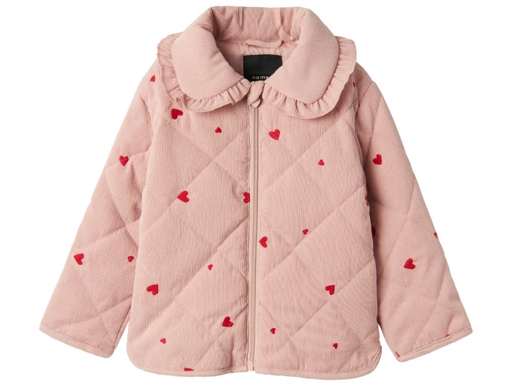 Quiltet jakke i farven pale mauve med broderi af hjerter fra Name It.