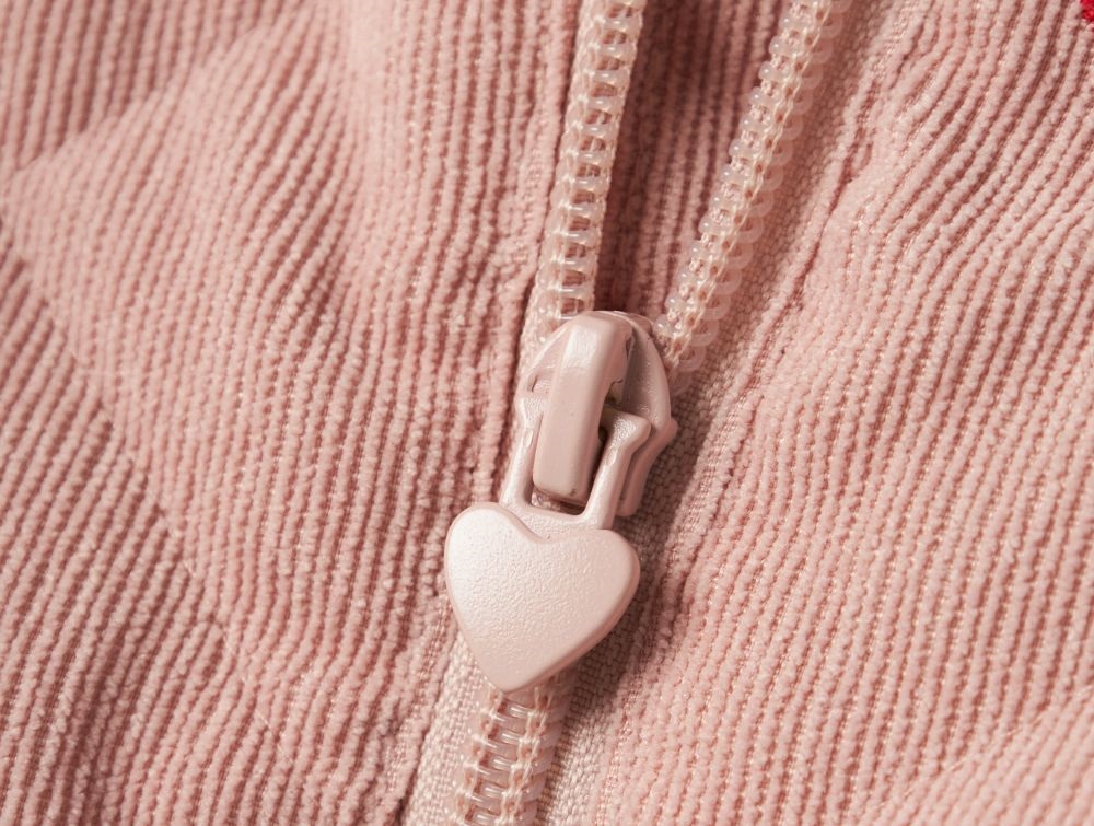 Sød quiltet jakke fra Name It i lyserød fløjlstruktur med fine broderede røde hjerter. Jakken har en feminin krave med flæsekant, lynlåslukning med et hjerteformet lynlåsgreb samt to sidelommer.