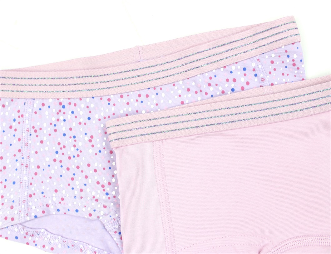 Pakken indeholder i alt 2 par underbukser i hver sin farve, den ene med forskelligfarvede prikker. Begge par har glitter elastikbånd.