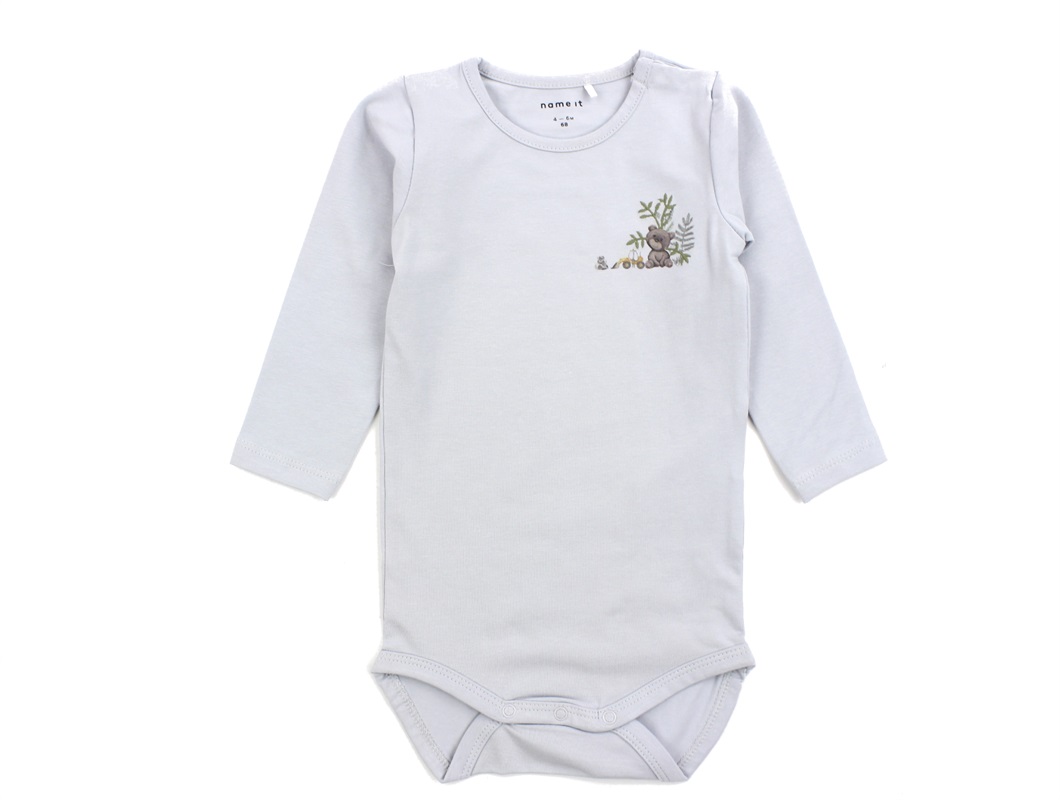 Body i farven pearl blue med bamseprint og broderi fra Name It.