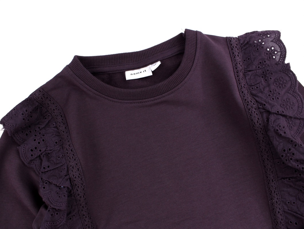 Sweatbluse i farven plum perfect med broderie anglaise flæser fra Name It.