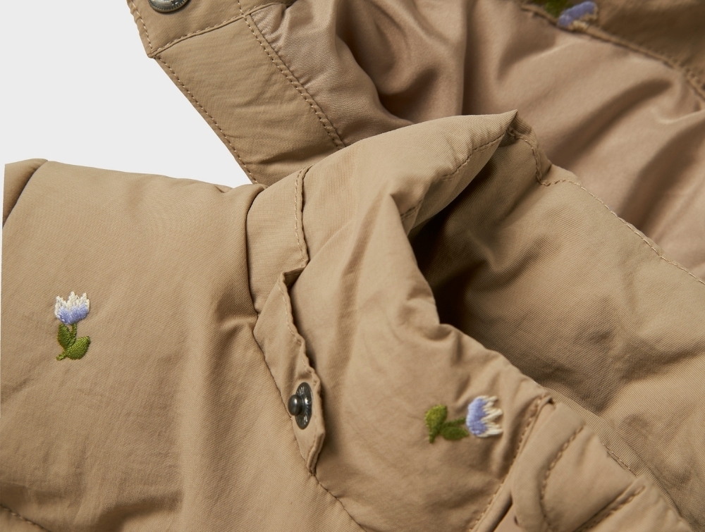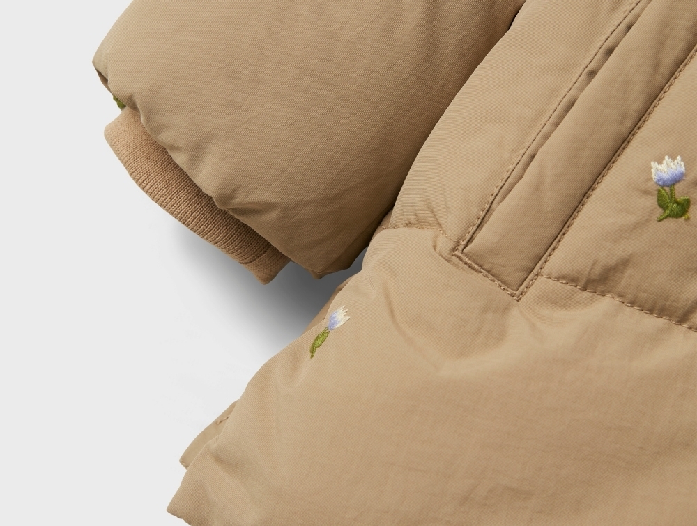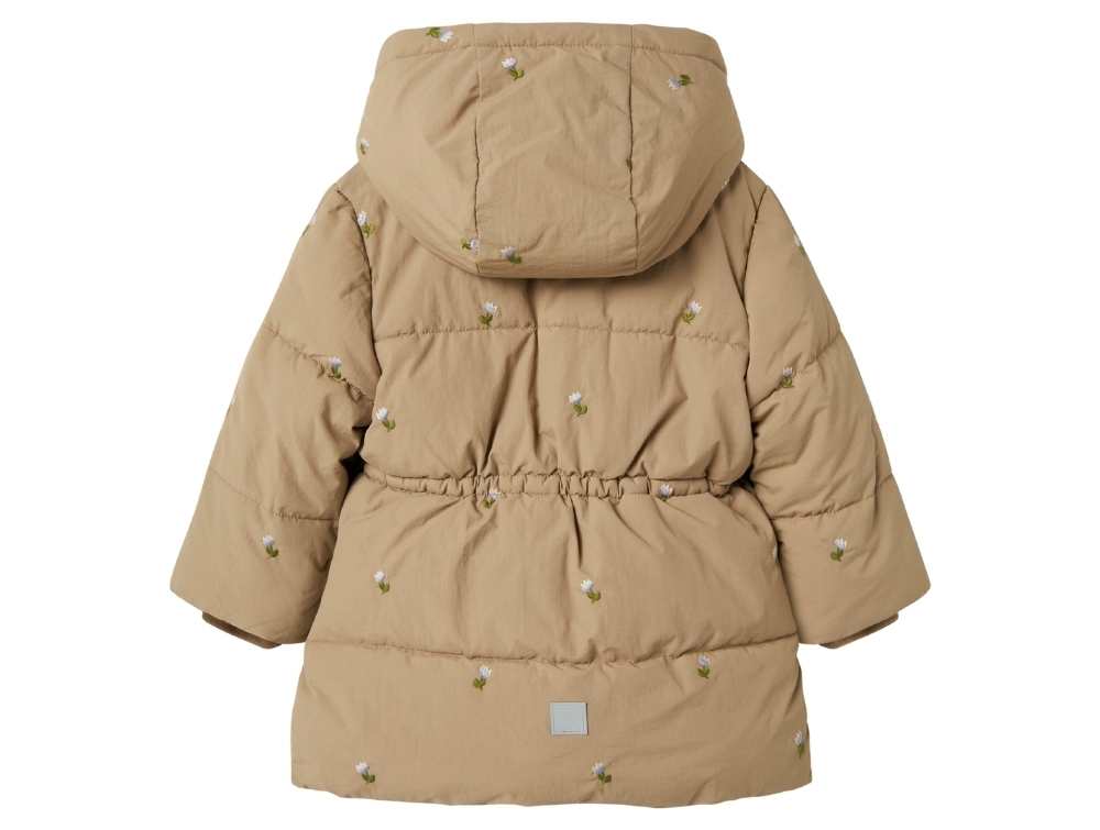 Pufferjakke i lys brun nuance (silver mink) fra Name It med fint all over blomsterbroderi.