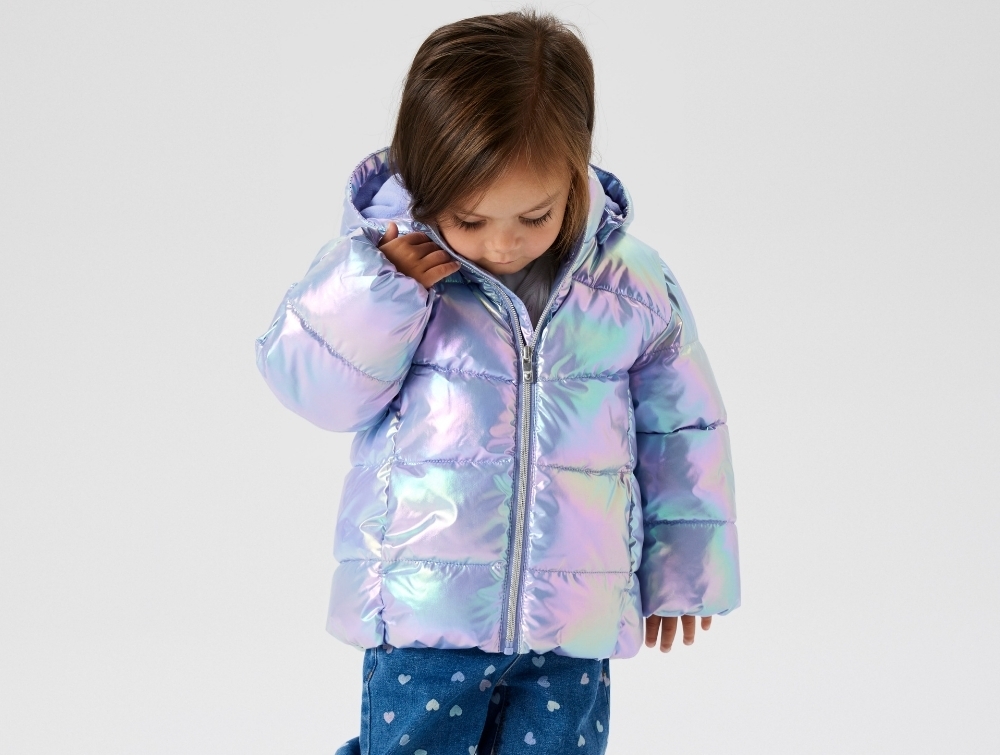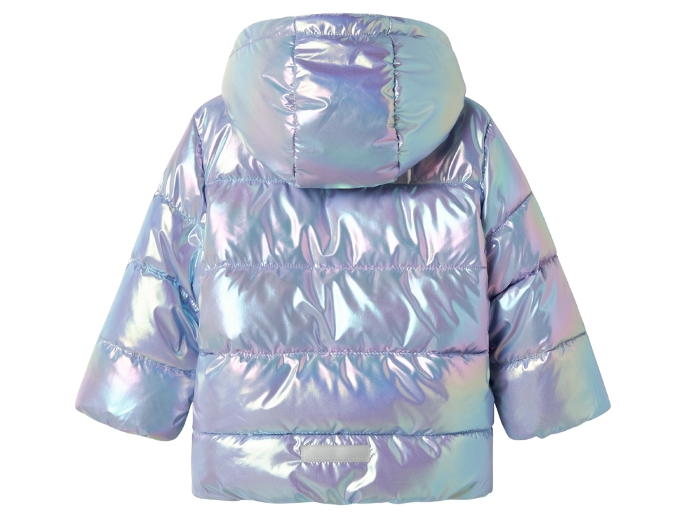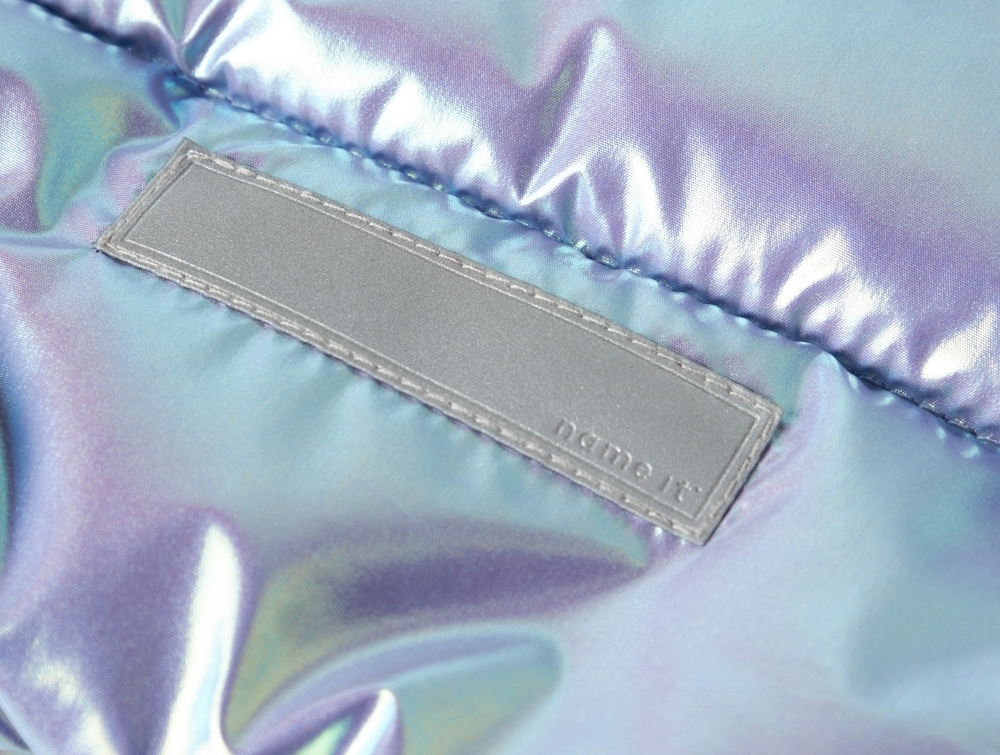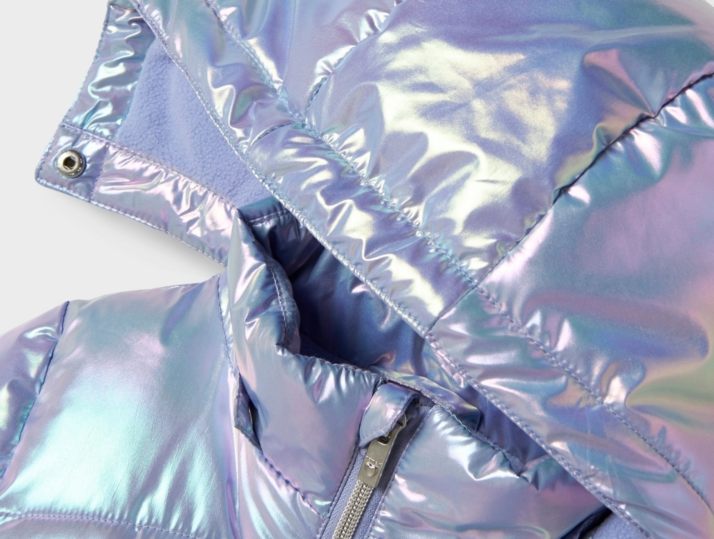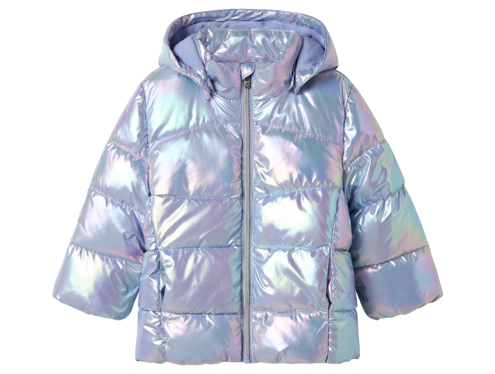 Pufferjakke i lilla nuance (pastel lilac) fra Name It med glansfuld metallisk overflade.