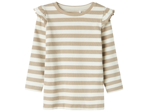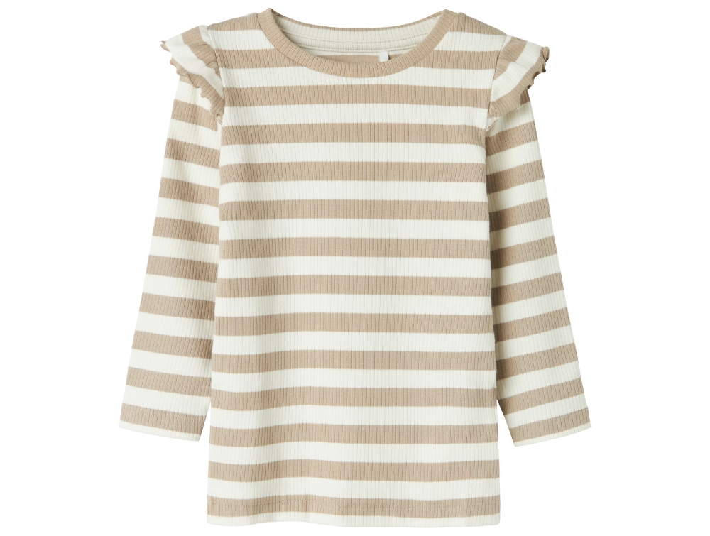 Langærmet stribet top i farverne pure cashmere/cloud dancer med flæser på skulder fra Name It.