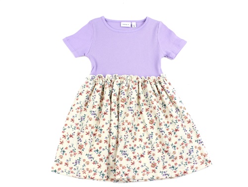 Kjole i farven purple rose med blomsterprintet underdel fra Name It.