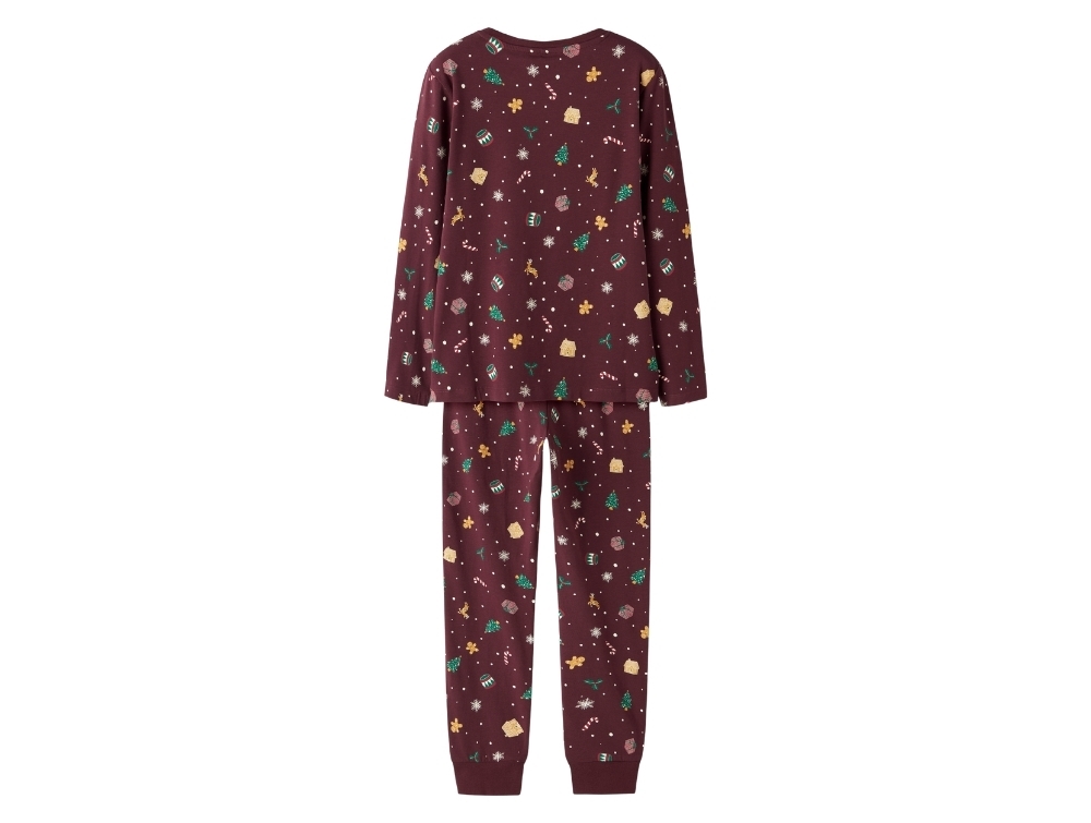 Name It pyjamas i burgundy med juleprintDetalje af juleprint på Name It pyjamas i burgundyBagside af Name It pyjamas i burgundy med juleprint