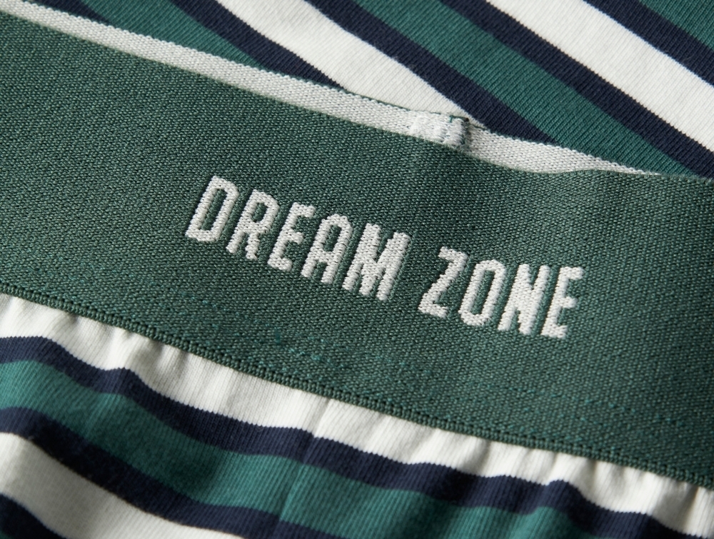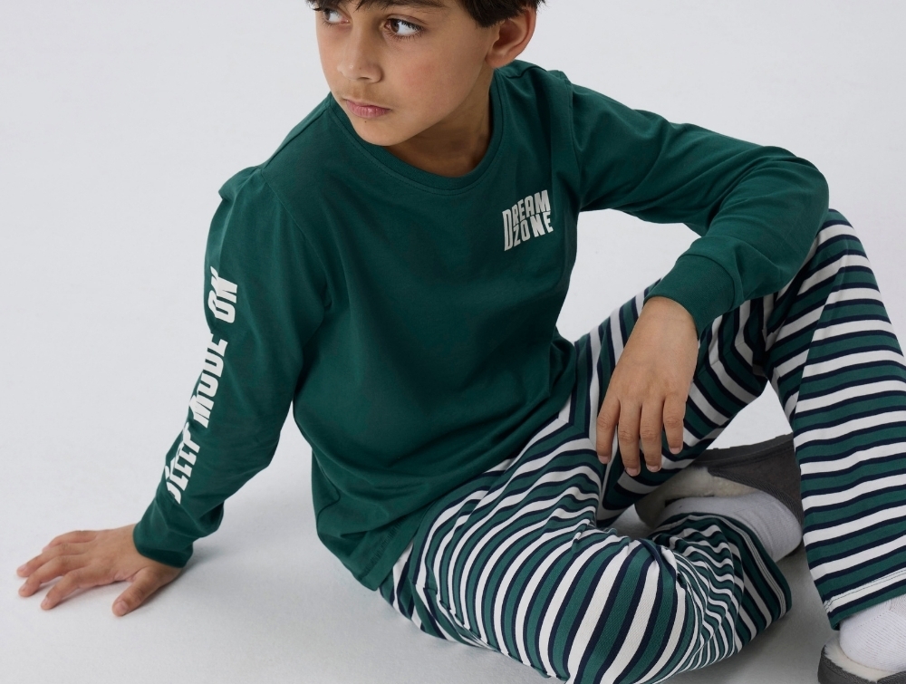 dreng iført grønt pyjamasæt fra Name It med stribede bukserpyjamasæt fra Name It i grøn med stribede bukserdetalje af elastik med dream zone tekst på Name It pyjamasbagside af grønt pyjamasæt fra Name It