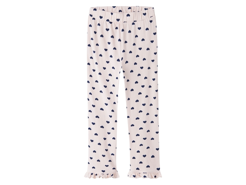 Nattøjssættet består af en langærmet bluse med et lille hjertebroderi foran og et par bukser med mørkeblå hjerter, fine flæser forneden og justerbar knaphulselastik i taljen.