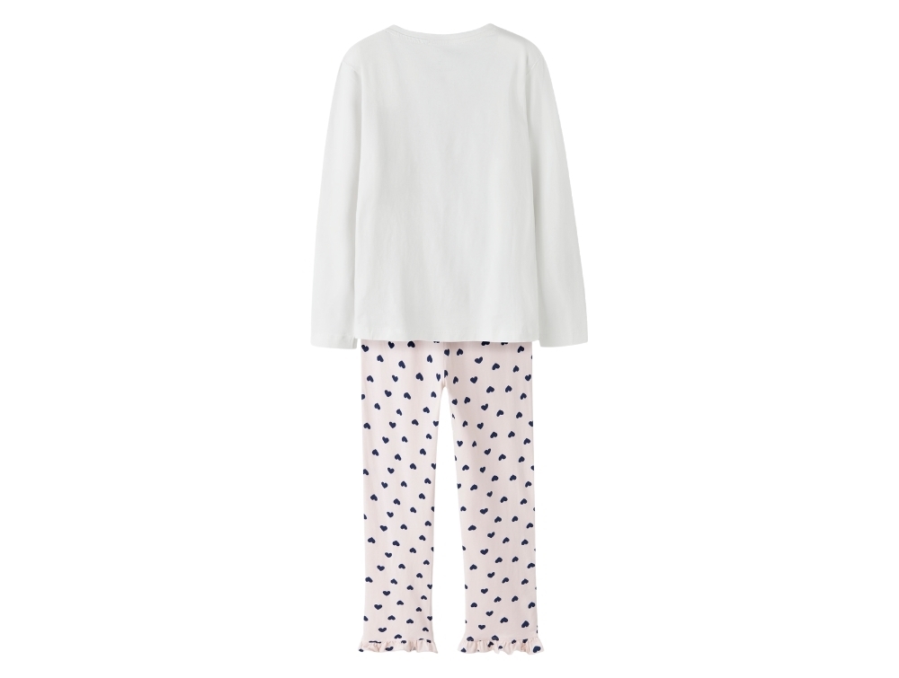pyjamas fra Name It i hvid og rosa med hjerteprintdetalje af hjerteprint og broderi på Name It pyjamaslyserøde pyjamasbukser fra Name It med mørkeblå hjerterbagside af pyjamas fra Name It i hvid og lyserød