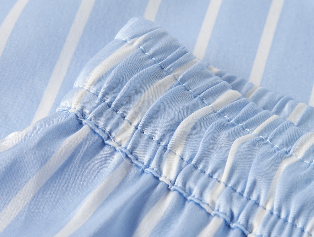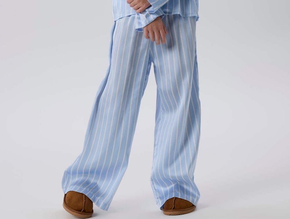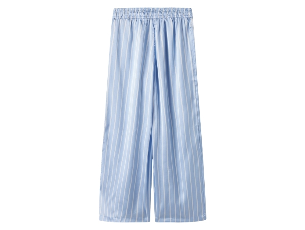 bukser fra Name It i lyseblå med hvide striberpige iført lyseblå stribede pyjamas fra Name Itdetalje af elastik i taljen på lyseblå Name It bukserpige iført lyseblå stribede bukser fra Name Itbagside af lyseblå bukser fra Name It med striber
