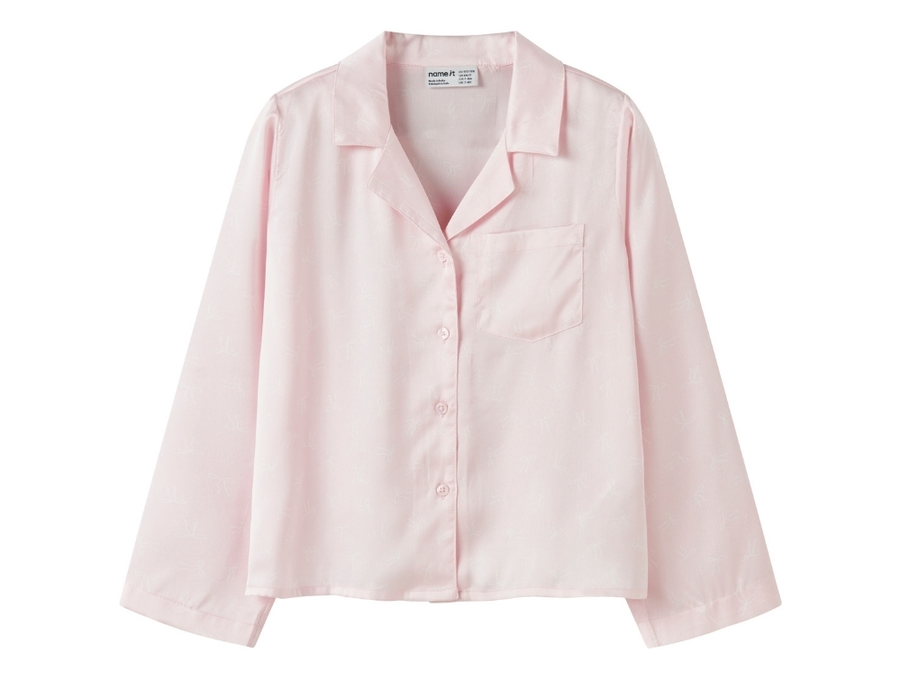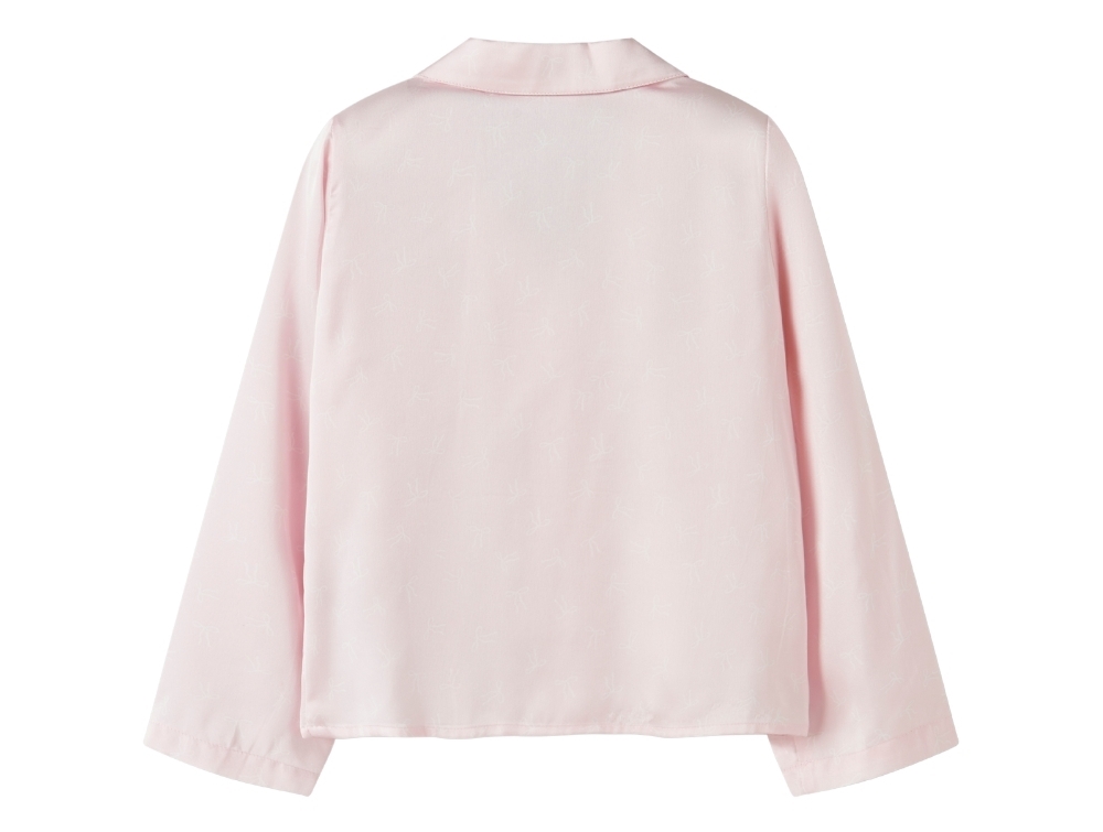 pyjamasskjorte fra Name It i lyserød med små sløjferdetalje af pyjamasskjorte fra Name It med knapper og brystlommebagside af lyserød pyjamasskjorte fra Name It