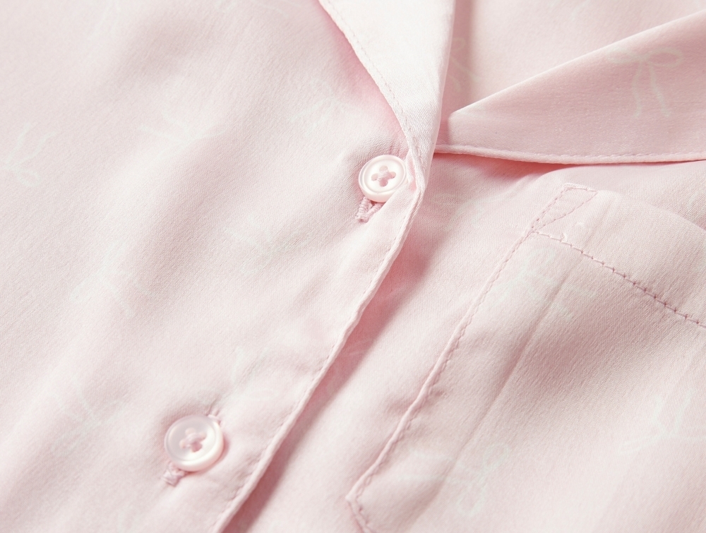 Skjorten har et diskret mønster med små sløjfer og er fremstillet i blød polyester med satinlook, der føles glat mod huden og giver et elegant udtryk.