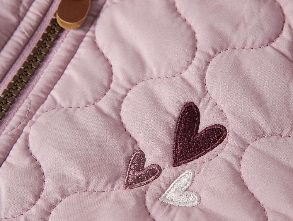 Name It quiltet jakke i rosa nuance på barnName It quiltet jakke set bagfra med enhjørningbroderiName It quiltet jakke i rosa nuance med hjertebroderiName It quiltet jakke med broderede hjerterName It quiltet jakke med refleks