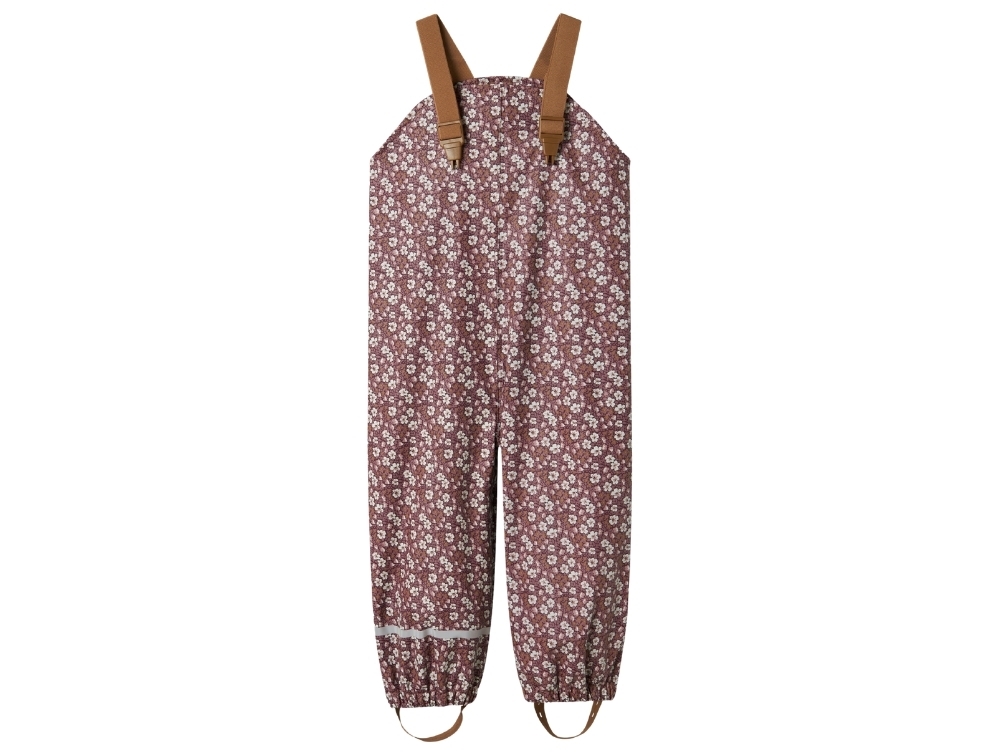 Barn iført Name It regnsæt med blomsterprint i fig farveName It regnsæt i violet med blomsterprint set forfraName It regnsæt i violet med blomsterprint set bagfraName It regnbukser i fig med blomsterprint og selerDetalje af hætte og krave på Name It regnsæt med blomsterprint