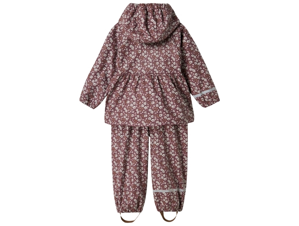 Regnsæt i violet nuance (fig) fra Name It med dekorativt blomsterprint og blød fleece indvendigt ved kraven.