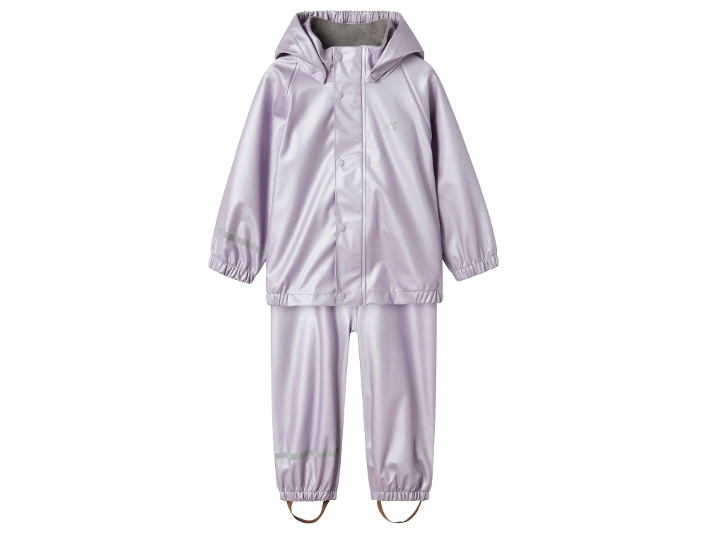 Regnsæt i metallisk lilla nuance (misty lilac) fra Name It med praktisk aftagelig hætte og refleksdetaljer på ærmer og ben.