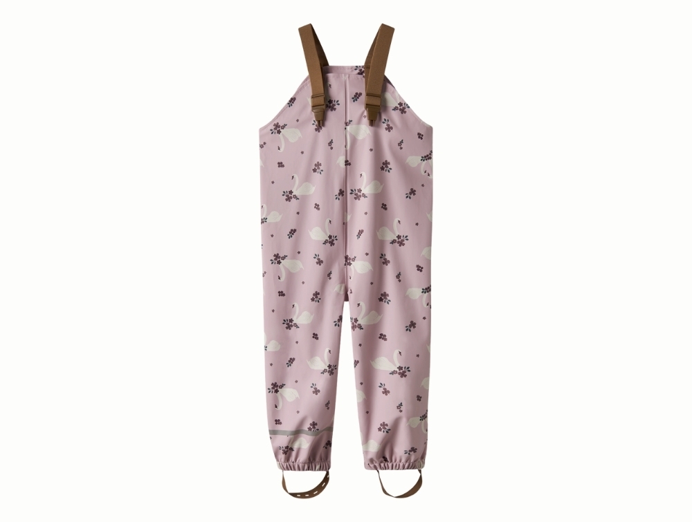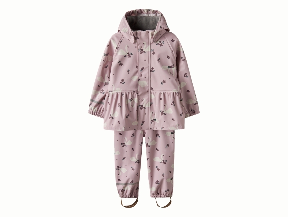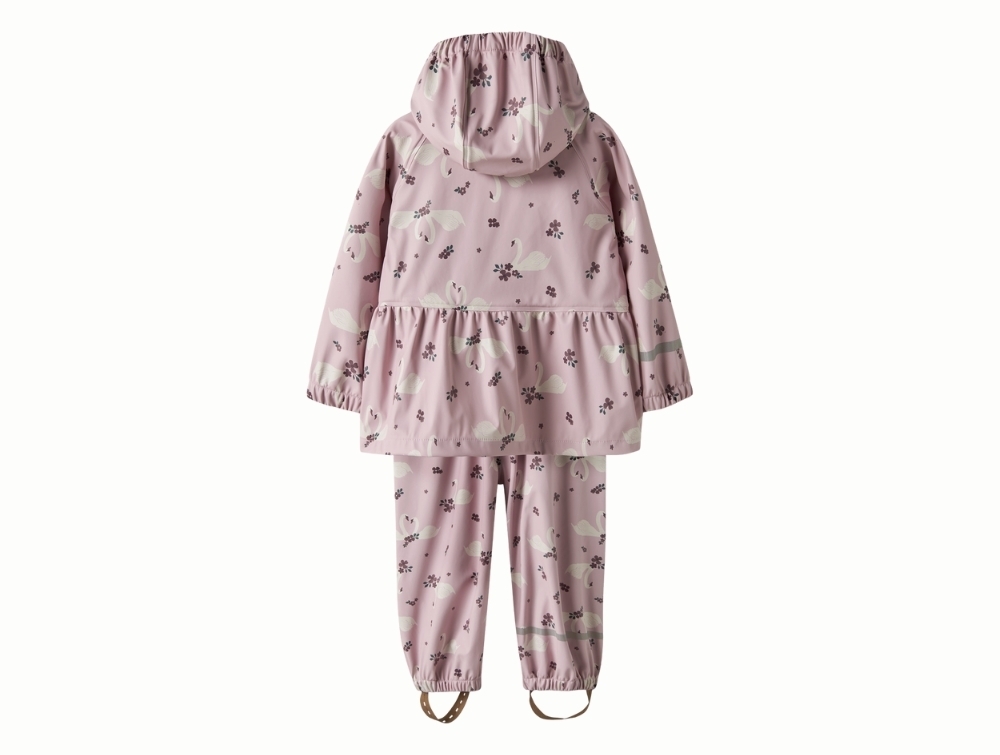 Regnsæt i lyserød nuance (keepsake lilac) fra Name It med allover svaneprint.
