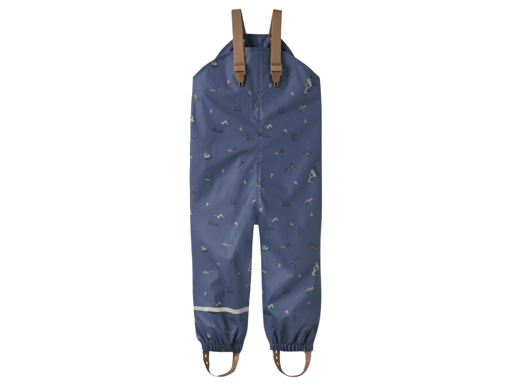 Sættet består af en regnjakke og matchende bukser med seler og refleksdetaljer. Det er fremstillet i vandtæt materiale med svejsede sømme, som holder barnet tørt i vådt vejr.