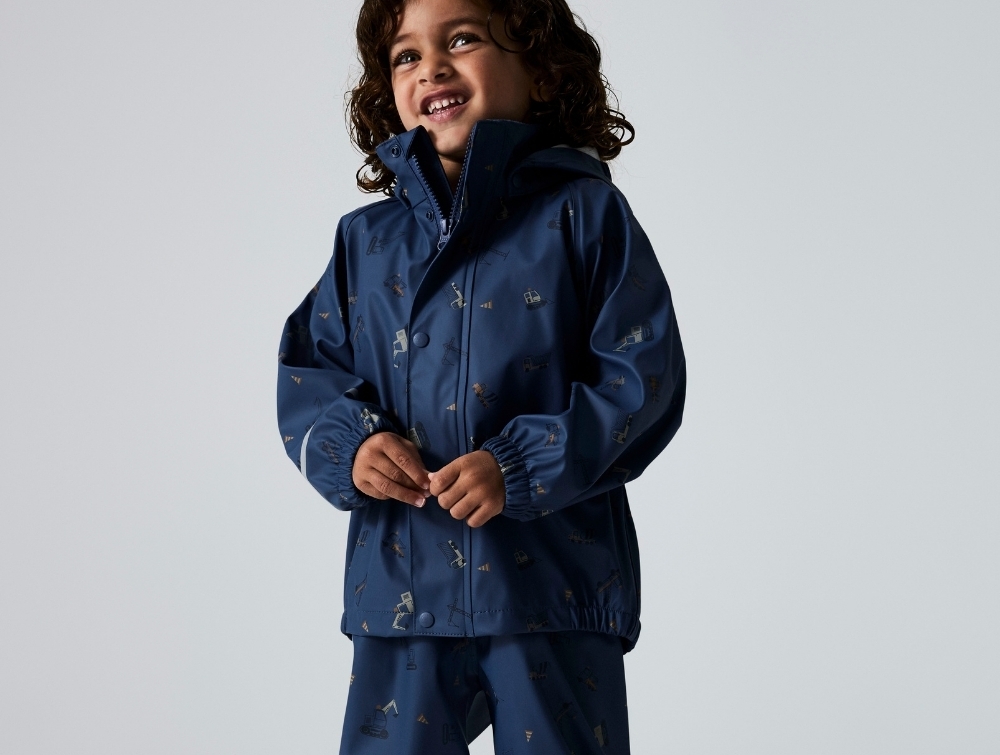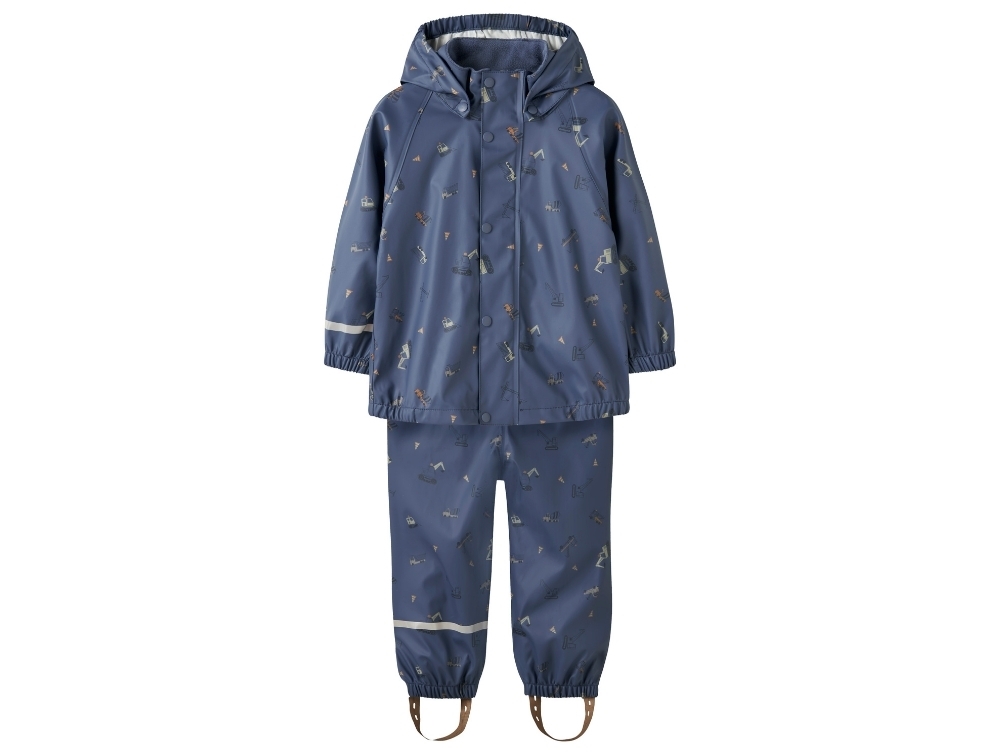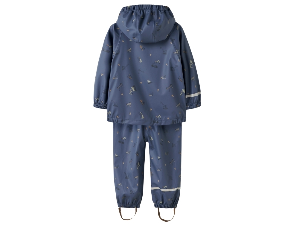 Regnsæt i blå nuance (vintage indigo) fra Name It med sjovt køretøjsprint og praktisk aftagelig hætte.