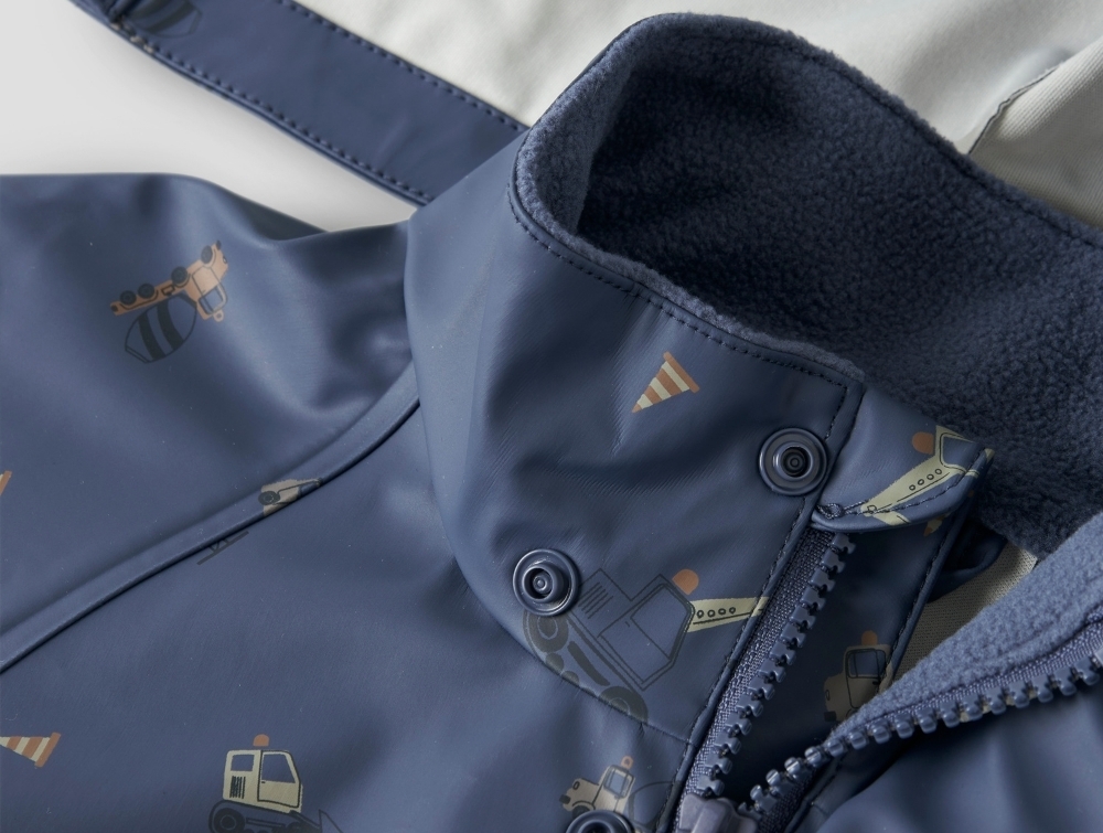 Name It regnsæt vintage indigo med print af køretøjer og aftagelig hætte