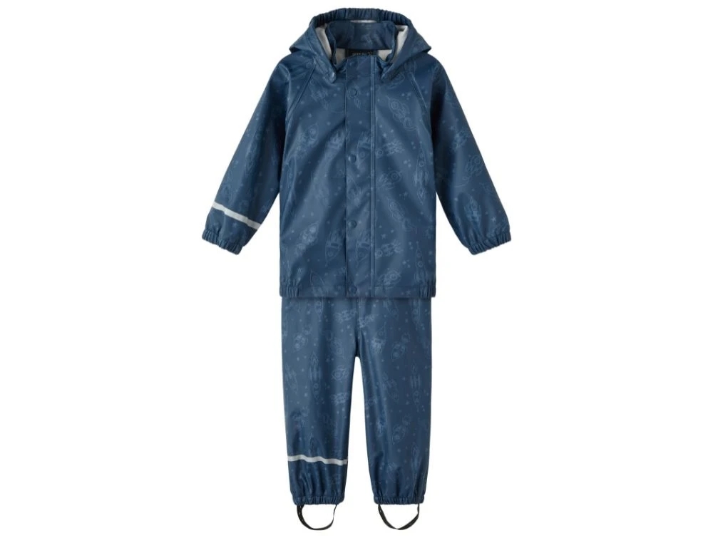 Regntøjssæt i farven moonlit ocean med astronautprint fra Name It.
