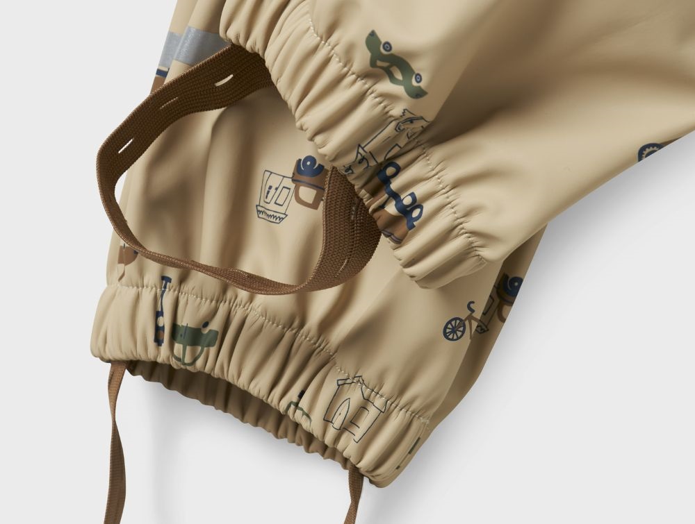 Dette funktionelle lysebrune regnsæt fra Name It holder barnet tørt og komfortabelt under udendørs leg. Sættet består af en jakke og bukser, der begge er vindtætte og har en vandtæthed på 10.000 mm med svejsede sømme for fuldstændig beskyttelse mod regn.