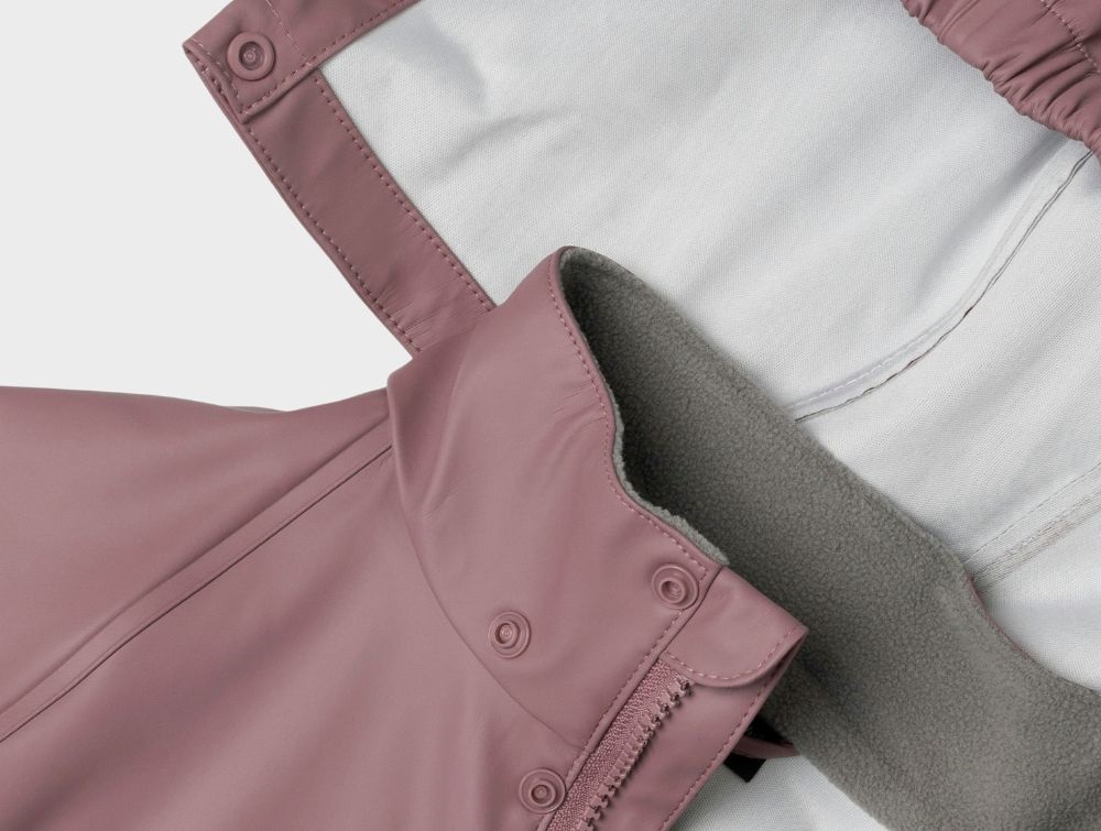 Jakken har aftagelig hætte, blød grå fleecekrave, lynlåsbeskytter og elastiske manchetter. Den lukkes med lynlås og trykknapper og har en refleksdetalje på det ene ærme. Bukserne har justerbare seler op til str. 104, elastiske benåbninger, refleksdetalje og aftagelige fodstropper, som sikrer god komfort og bevægelsesfrihed.