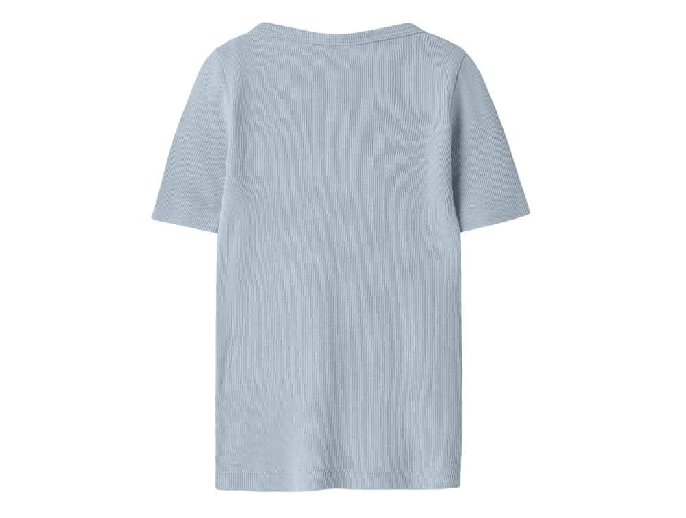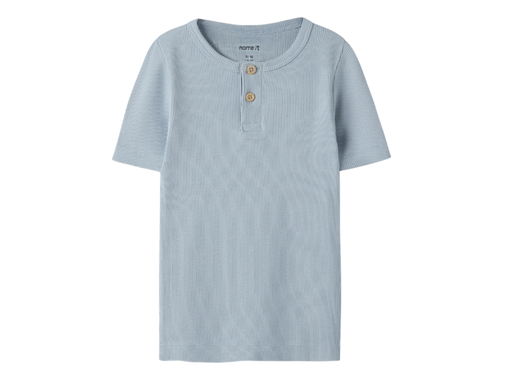 T-shirt i blå nuance (Blue Fog) fra Name It med ribstruktur og to knapper ved halsen.