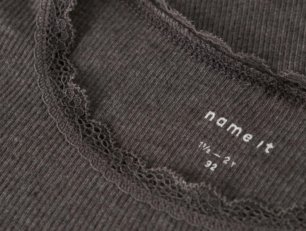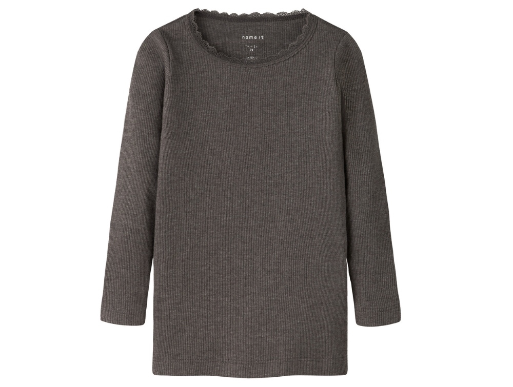 Ribbluse i mørk brun nuance fra Name It. En klassisk langærmet bluse i blød, strækbar rib med rund hals og fine blondekanter, der giver et feminint udtryk.