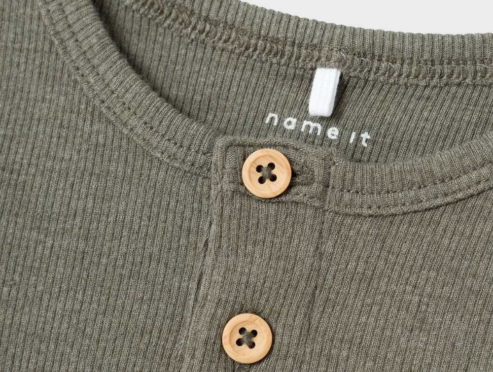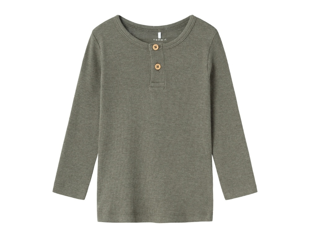 Ribbluse i støvet olivengrøn nuance fra Name It. En klassisk langærmet bluse i blød, strækbar rib med rund hals og to knapper foran, der giver et afslappet og tidløst udtryk.