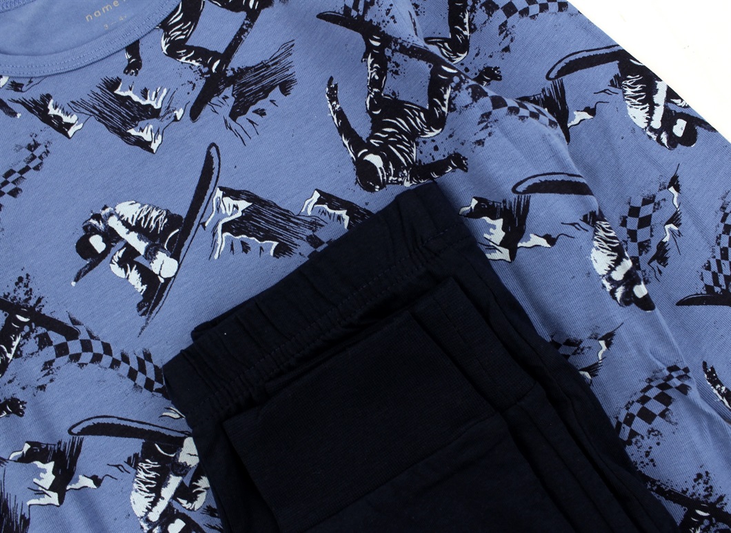 Pyjamas i farven riviera med snowboard-print fra Name It.
