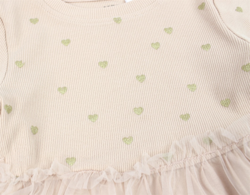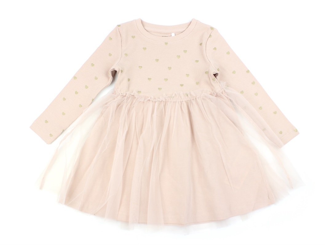 Kjole i ribkvalitet i farven rose smoke med tylskørt og glitterhjerter fra Name It.