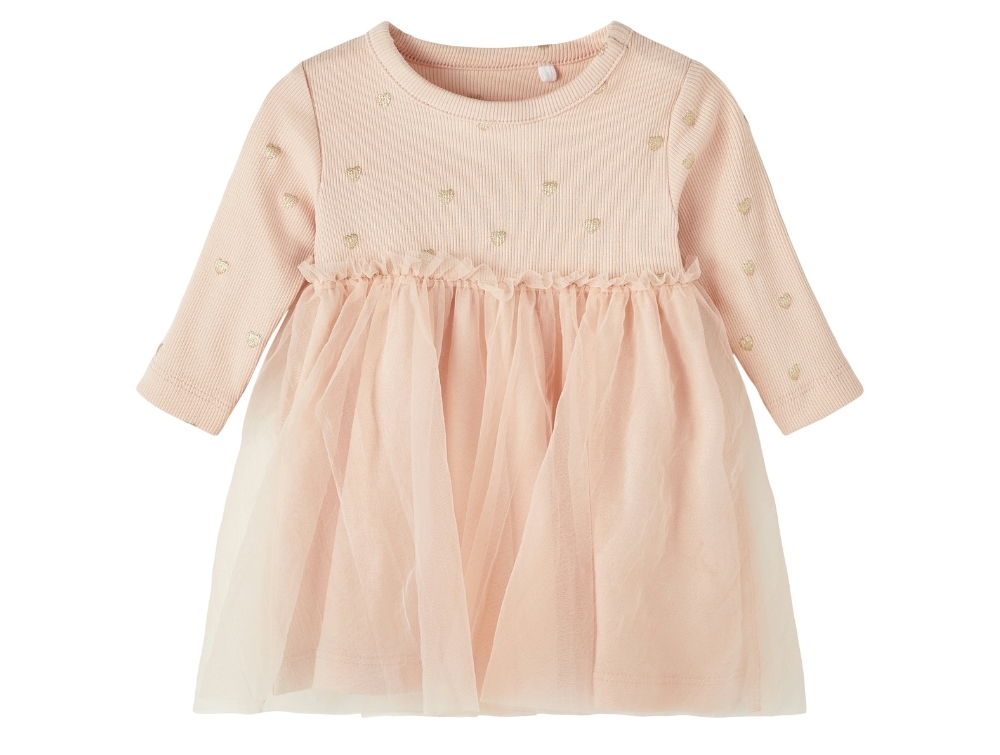 Kjole i ribkvalitet i farven rose smoke med tylskørt og glitterhjerter fra Name It.
