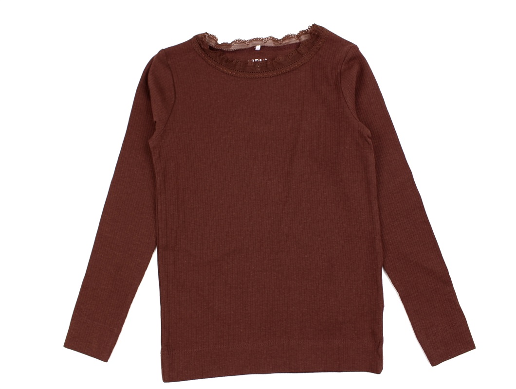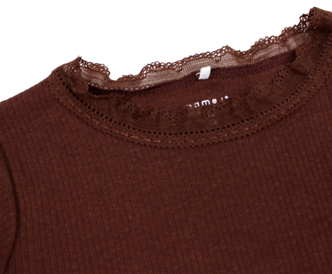 Langærmet top i farven rum raisin med blonde ved halsåbning fra Name It.