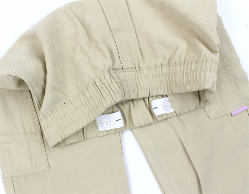 Bukserne har justerbar elastik i linningen og elastik i bukseben samt fire åbne lommer.