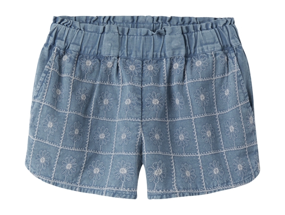 Shorts i blå nuance (faded denim) fra Name It med broderede blomster.