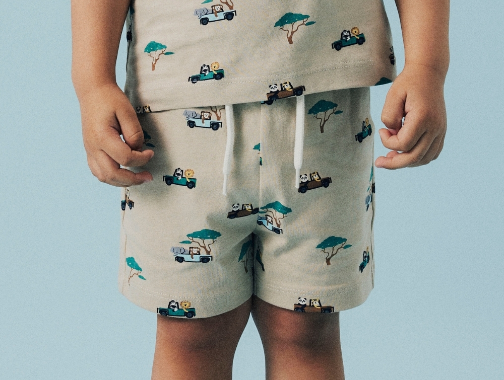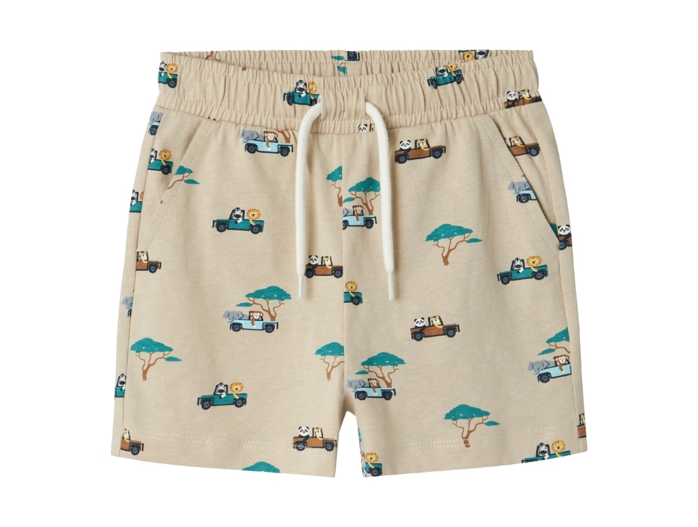 Shorts i beige nuance (island fossil) fra Name It. Modellen har et gennemgående safariprint med biler, dyr og træer.