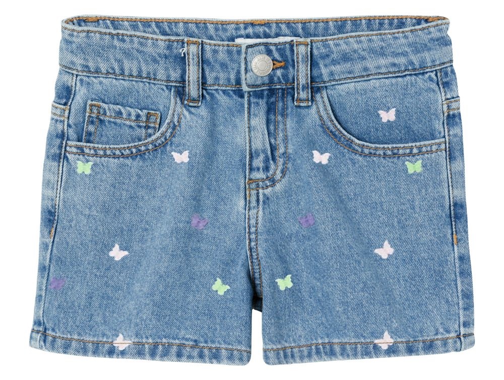 Søde denimshorts fra Name It i en lys blå vask med fine sommerfuglebroderier. Shortsene er lavet i en blanding af almindelig og økologisk bomuld, hvilket giver en blød og behagelig kvalitet.