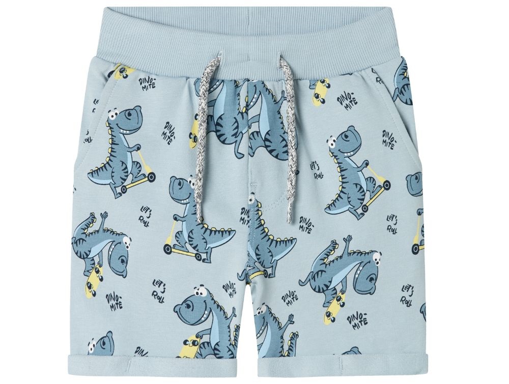 Shorts i lyseblå fra Name It med et legende allover-print af blå dinosaurer på løbehjul og teksten "dino-mite" og "let's roll".