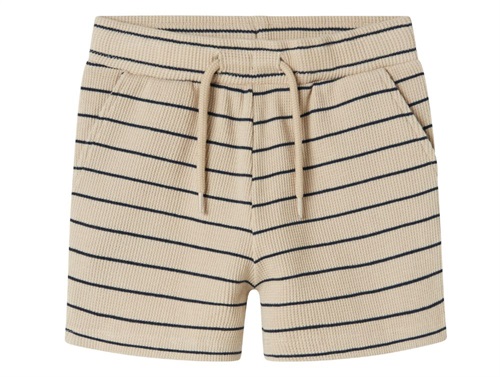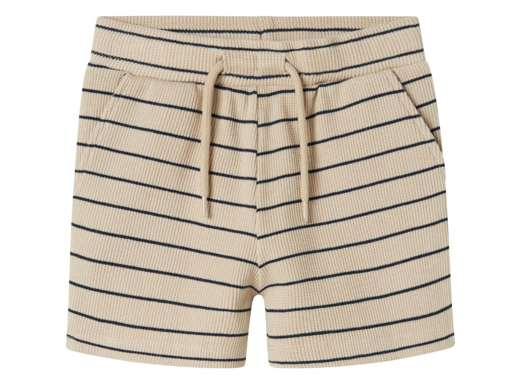 Bløde og behagelige shorts fra Name It i waffel kvalitet i en beige nuance med klassisk smalstribet mønster i mørkeblå. Shortsene har en regulær pasform og er lavet i en bomuld med en struktureret overflade, der giver et let og sommerligt udtryk.